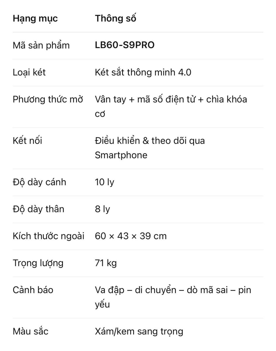 Liberty LB60-S9PRO là mẫu két sắt thông minh thế hệ mới nhất, kết hợp hoàn hảo giữa độ an toàn cao cấp và thiết kế nội thất sang trọng. Với khả năng kết nối điện thoại, bảo mật đa lớp và kết cấu thép siêu cứng, đây là sản phẩm lý tưởng dành cho gia đình, cửa hàng và doanh nghiệp