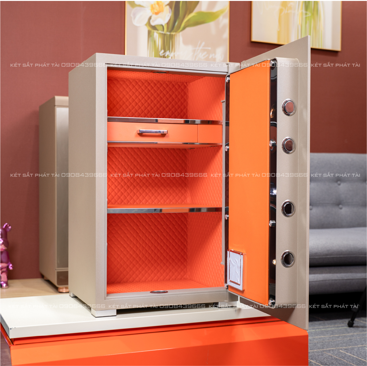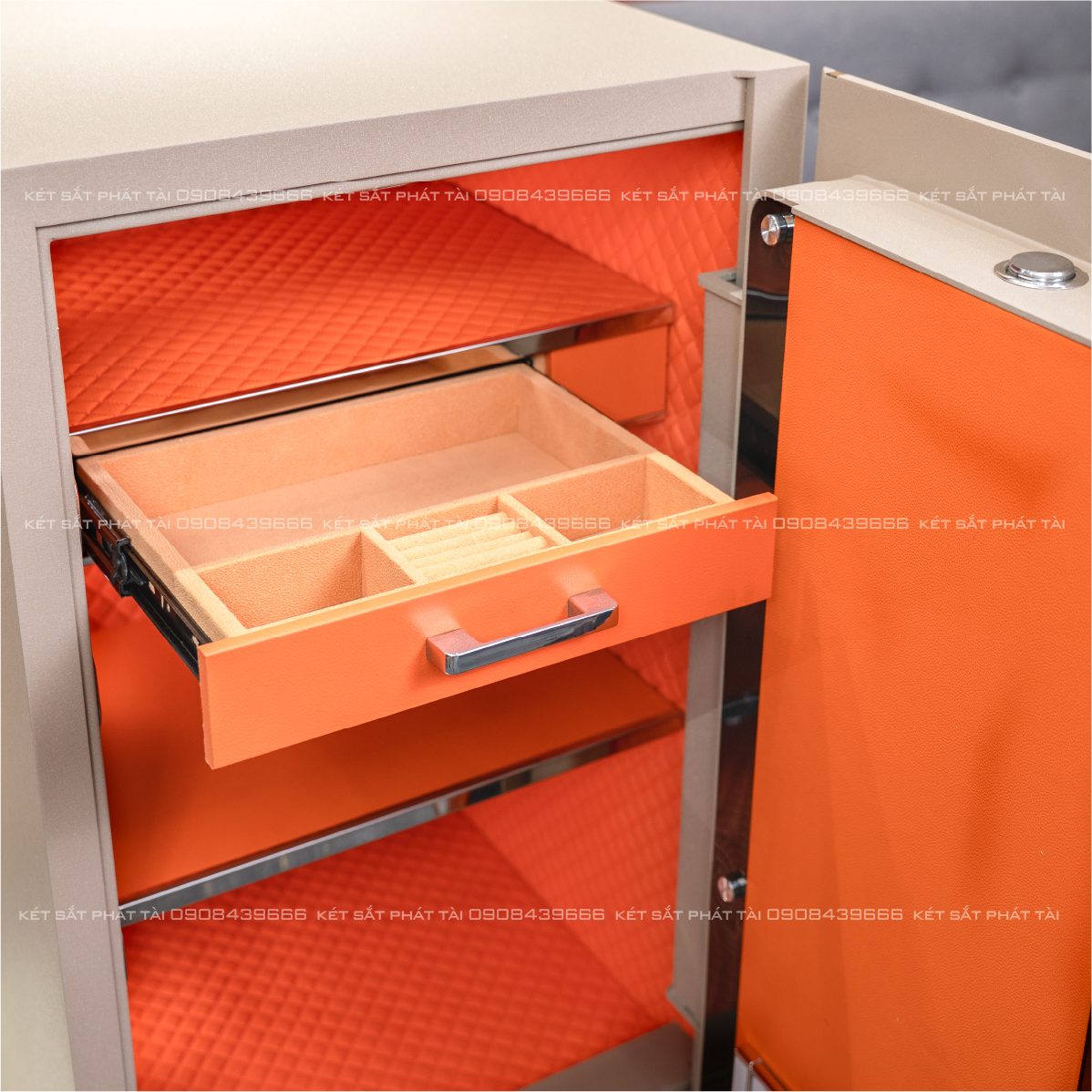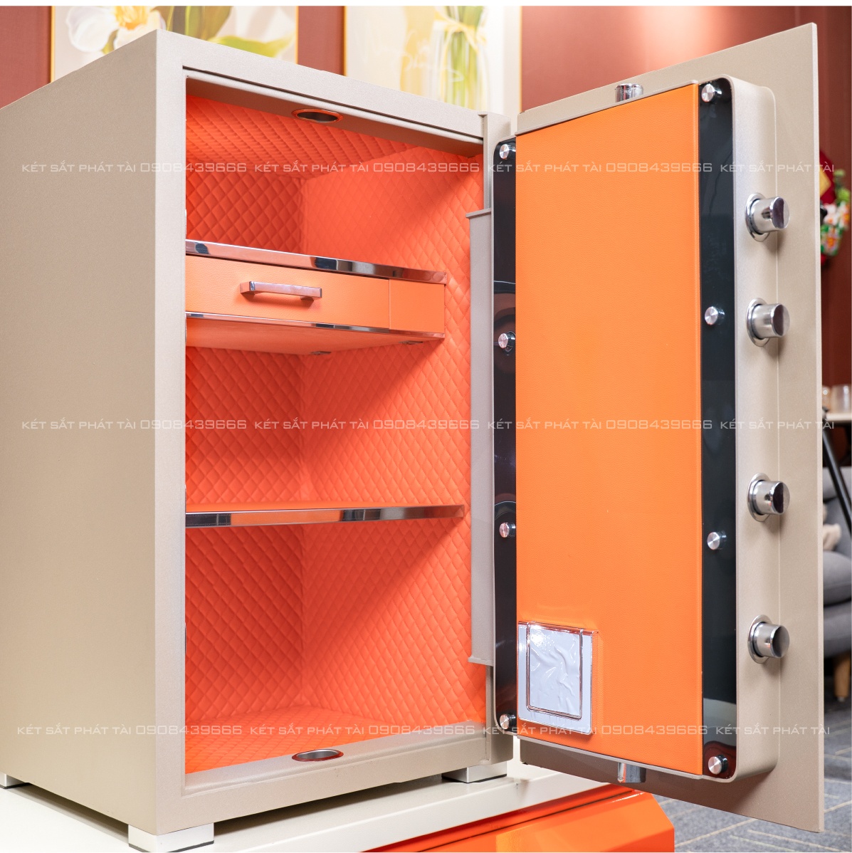 Bên trong két là lớp da PU màu cam cao cấp, mang đến cảm giác sang trọng và bảo vệ tài sản tốt hơn. Thiết kế nội thất thông minh gồm: